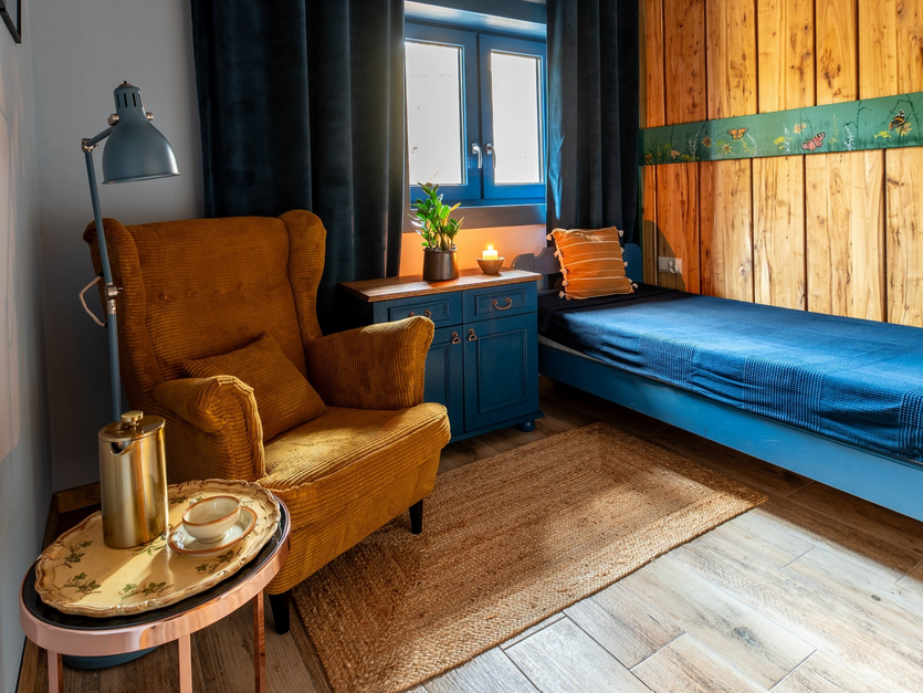 🏡 Wozownia – oprócz sali warsztatowej i salonu znajdują się tu cztery pokoje jednoosobowe, każdy z prywatną łazienką 🚿.